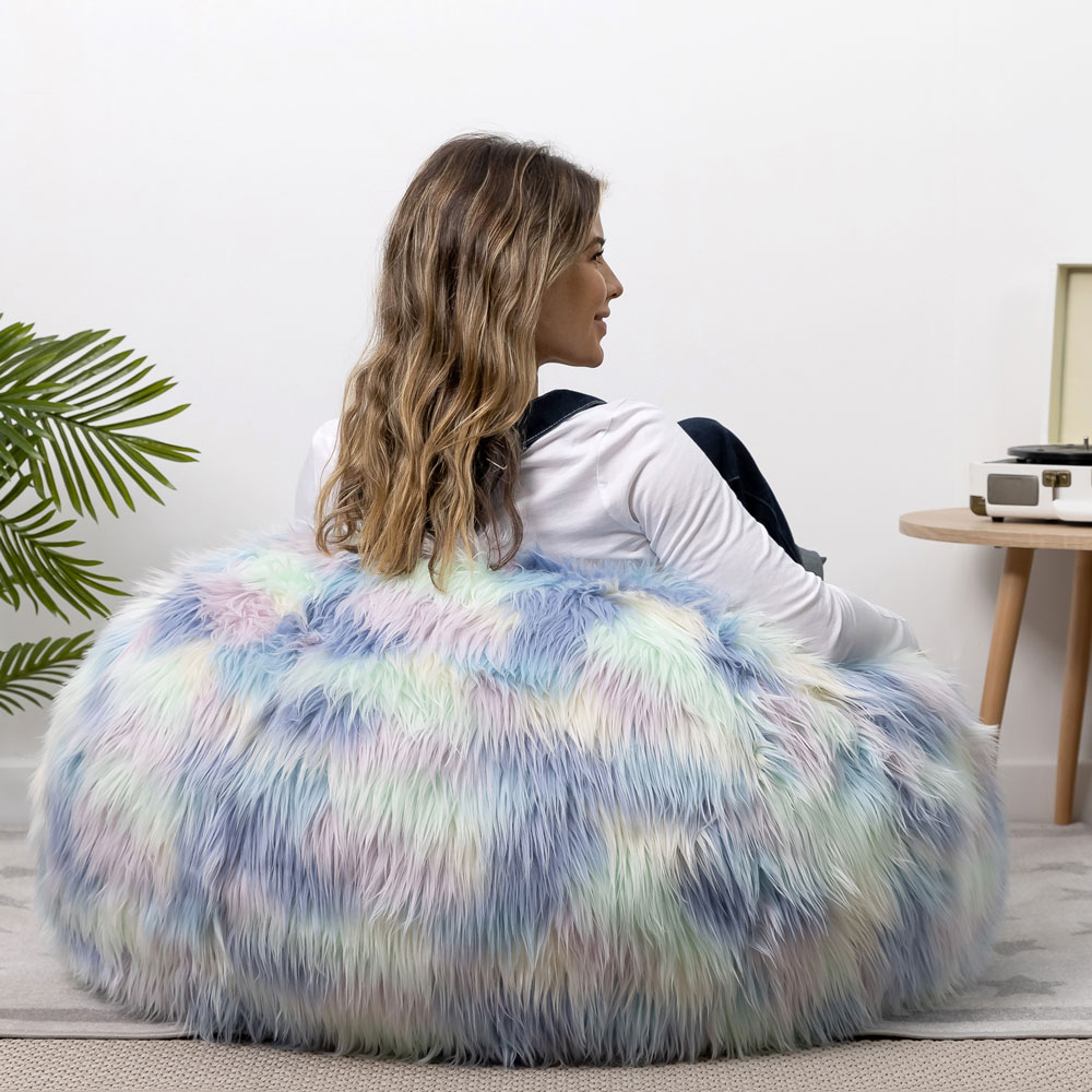 SUPER SOFT FAUX FUR: Curl up in pure comfort. This soft faux fur bean bag chair lets you snuggle in anywhere. The mix of colours adds a pop of colour to any space.